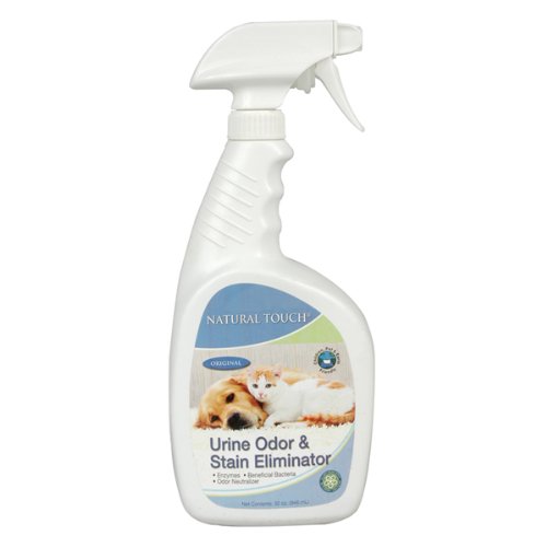 Removes organic stains and odors caused by urine, feces, vomit, blood etc. on carpets, upholstery, clothing, bedding, drapes, floors, cages and other water-safe surfaces. Natural Touch Enzyme Odor & Stain Eliminator is a unique, bio-enzymatic cleaning formulation specifically designed to speed up the natural biodegredation process. When applied to any organic related stain or odor, its biological activity works naturally to permanently eliminate the problem. Effective on old & new stains and odors. Environmentally friendly. Ready to use - no mixing necessary. Directions: Pre-test on hidden area before using on carpet & fabrics. If color appears on cloth, DO NOT USE! Remove excess surface solids. Blot with a towel or use a wet vacuum to soak up excess pet urine. Pour 4-6 ounces of fresh water on area to dilute the urine, soak up using a towel or wet vacuum. Repeat this process 2-3 times. Dilution is a very important step for total urine removal. Apply a liberal amount of Enzyme Odor & Stain Remover to affected area and allow to stand. Fold a towel and lay it on the treated area and allow to dry. Once dried, if stain and odor remains, repeat the above procedure.